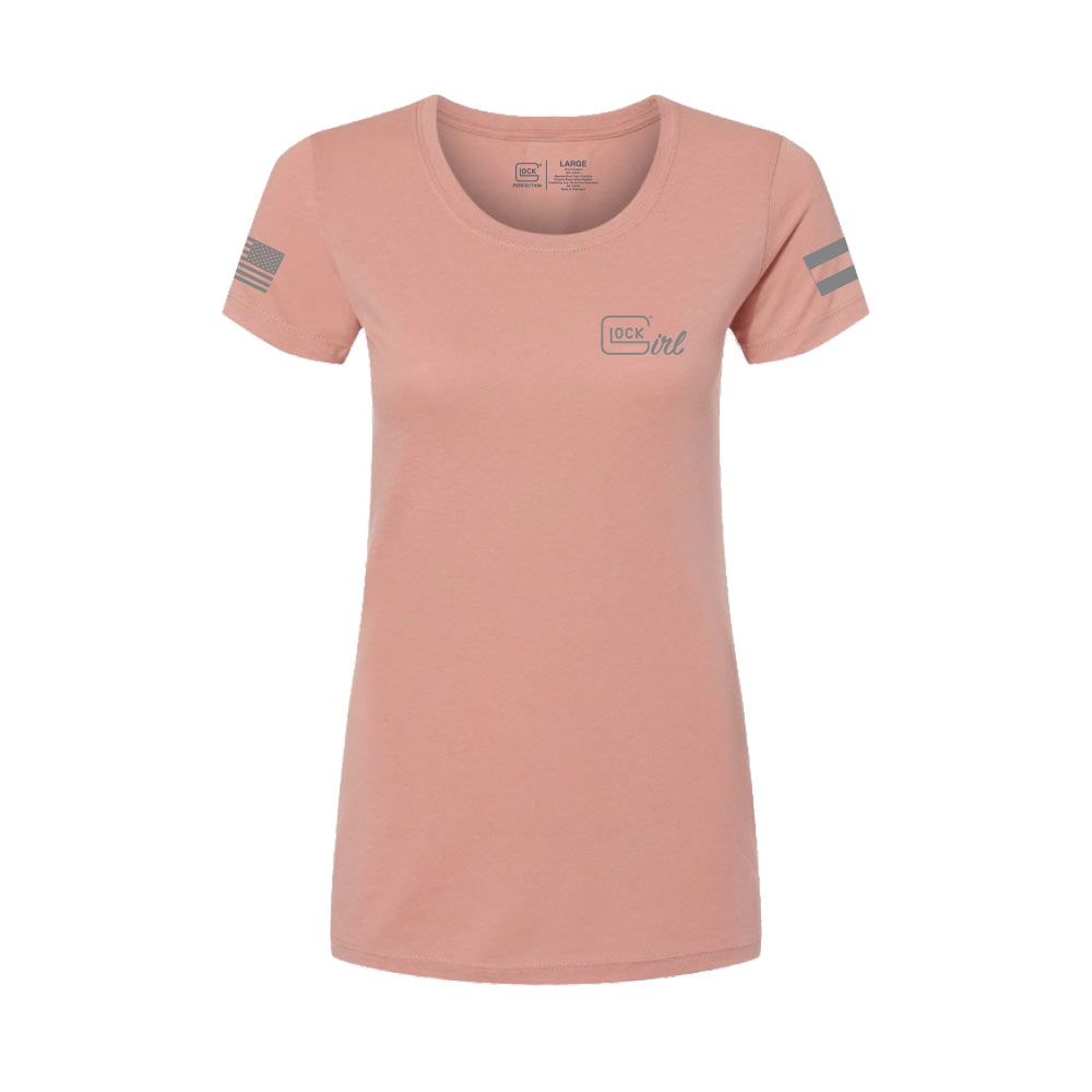 Show your style with the GLOCK Girl Flag Tee in Pink, designed for comfort and subtle branded flair. Made from soft, breathable fabric, this tee offers a flattering women’s cut with a gentle scoop neckline and a tailored fit. The front features a small GLOCK Girl logo, while the sleeve displays a stylized flag graphic for an added touch of attitude. Perfect for range days, casual wear, or everyday lifestyle outfits, this tee blends comfort, identity, and understated toughness.